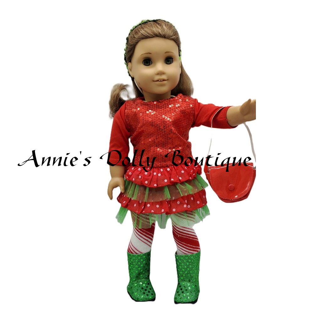 Your doll will look fantastic for the holidays in the 5-piece red and green outfit.