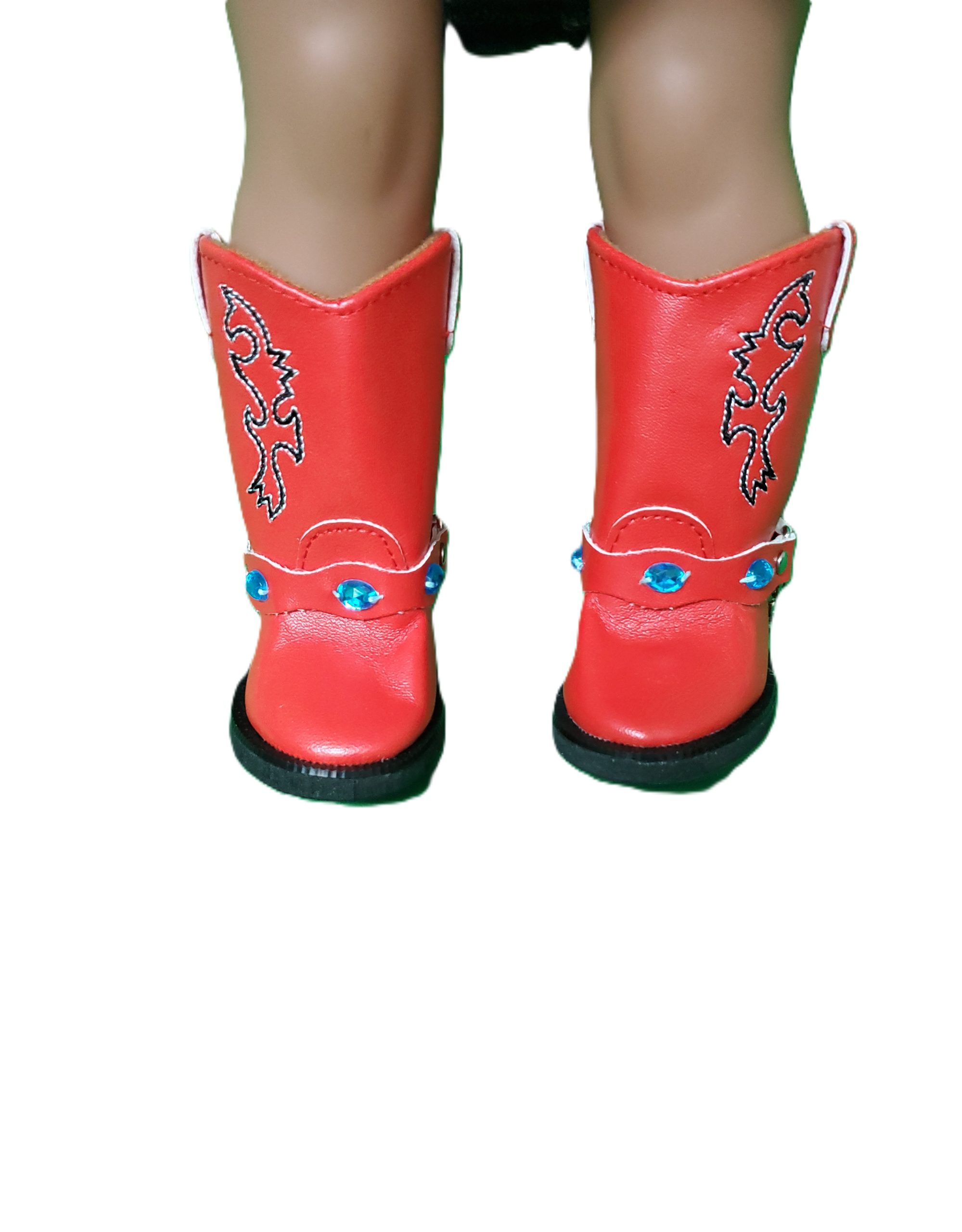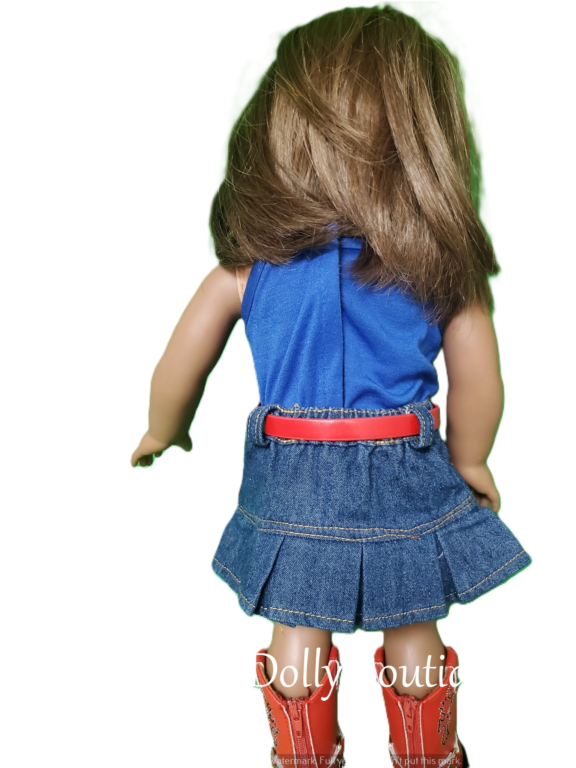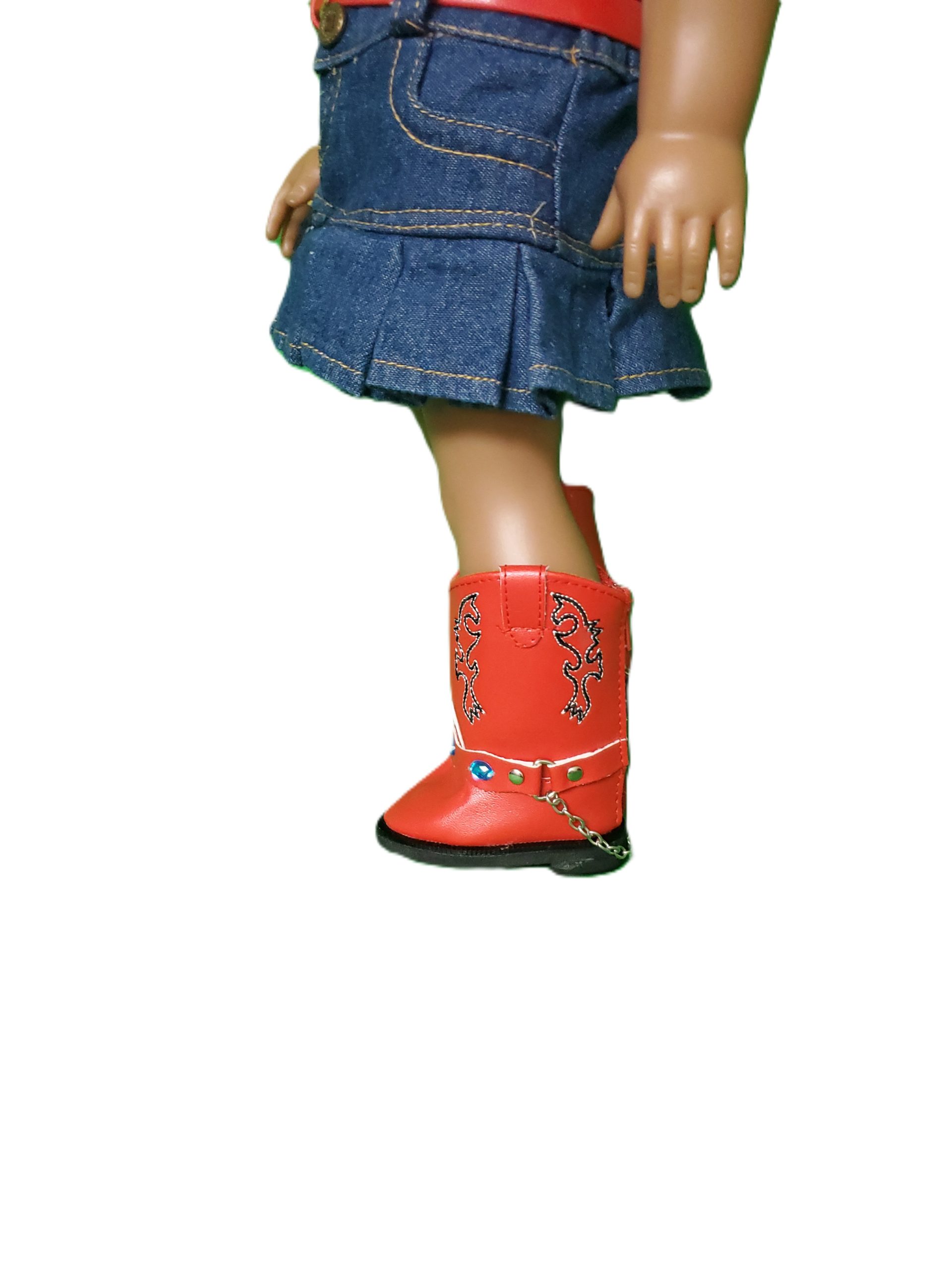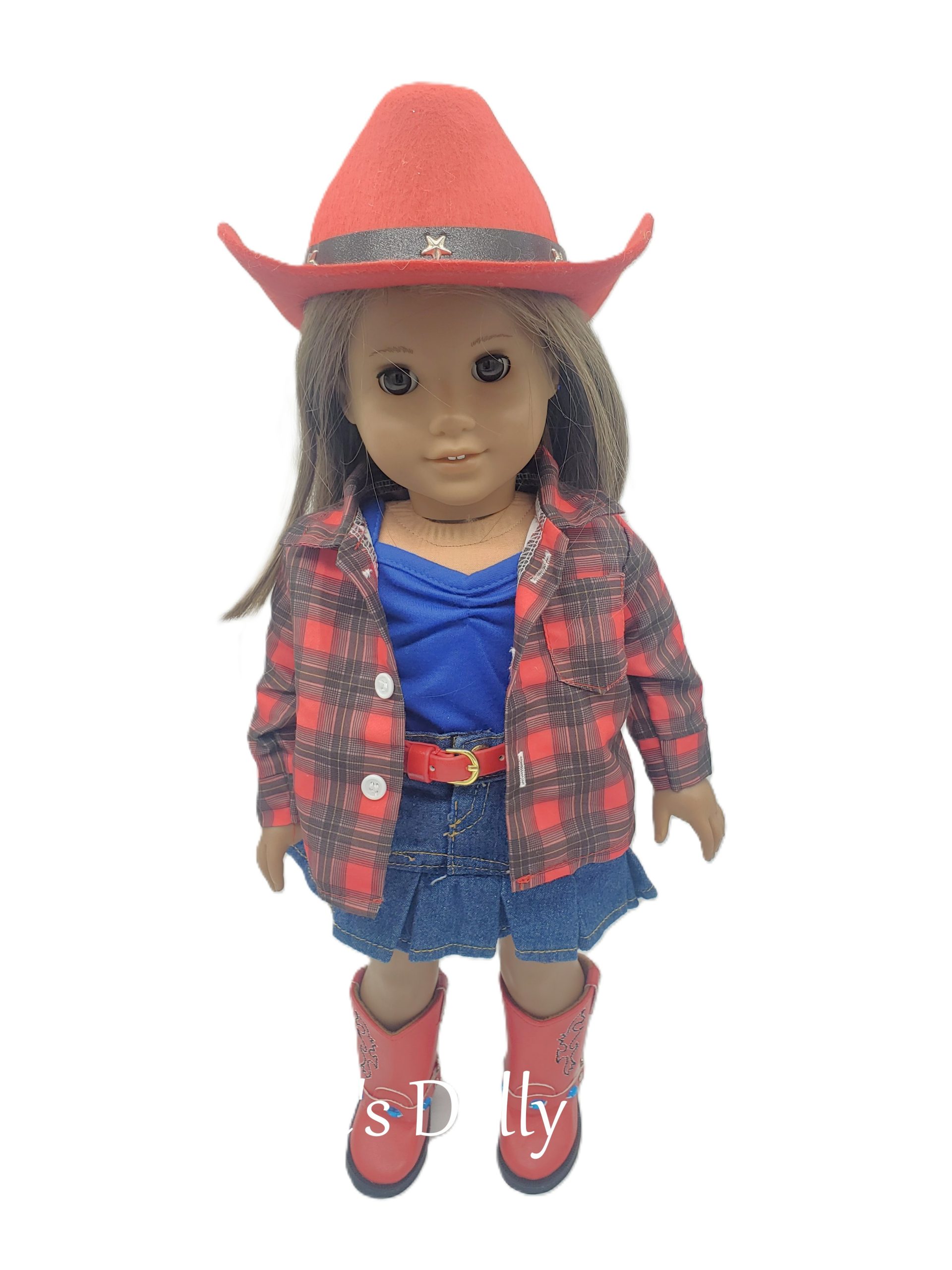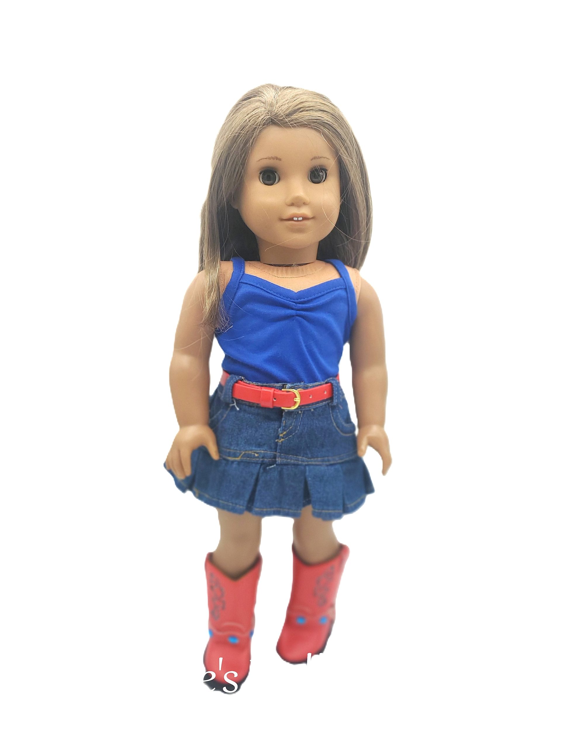 Your doll will look absolutely adorable in a chic denim skirt that flares gently at the hem, paired with a bright blue t-shirt that pops with color. She’ll complete her outfit with eye-catching red boots that shine with each step, a fashionable belt that cinches at the waist, and an on-trend cowgirl hat adorned with a playful band. This ensemble combines classic style with a fun, contemporary twist, making your doll the star of any playtime adventure!