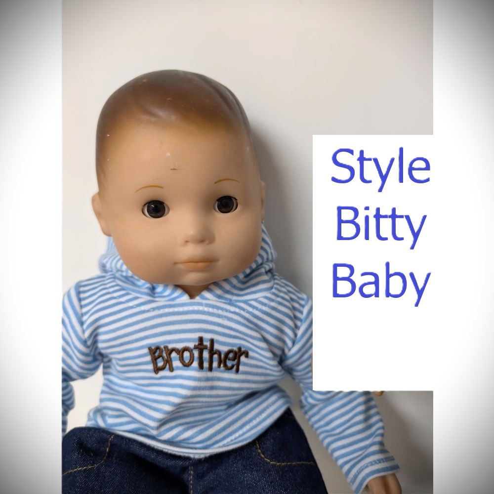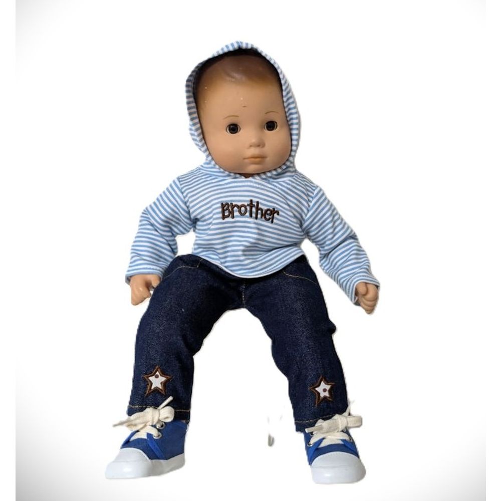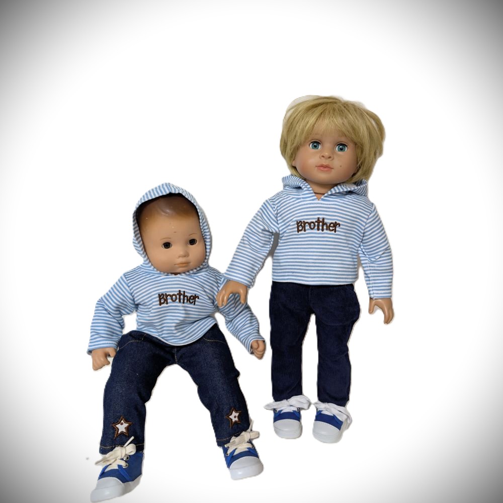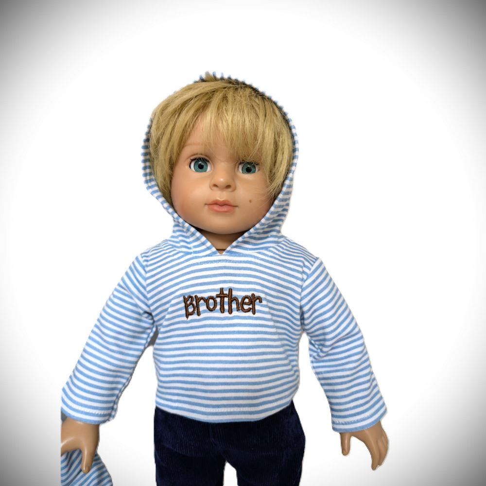 The 16-inch style features jeans, blue sneakers, and a cute blue-and-white striped hooded top with the word “Brother” embroidered on the front.