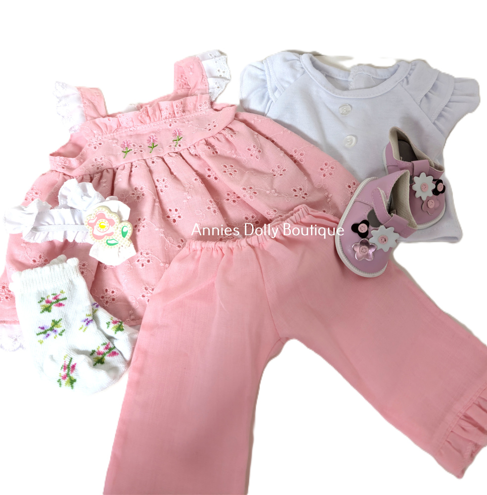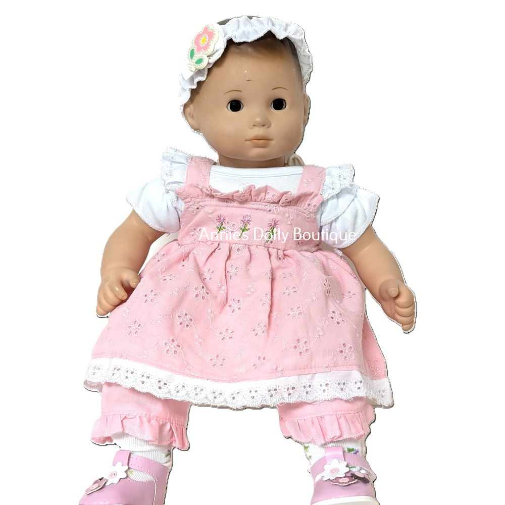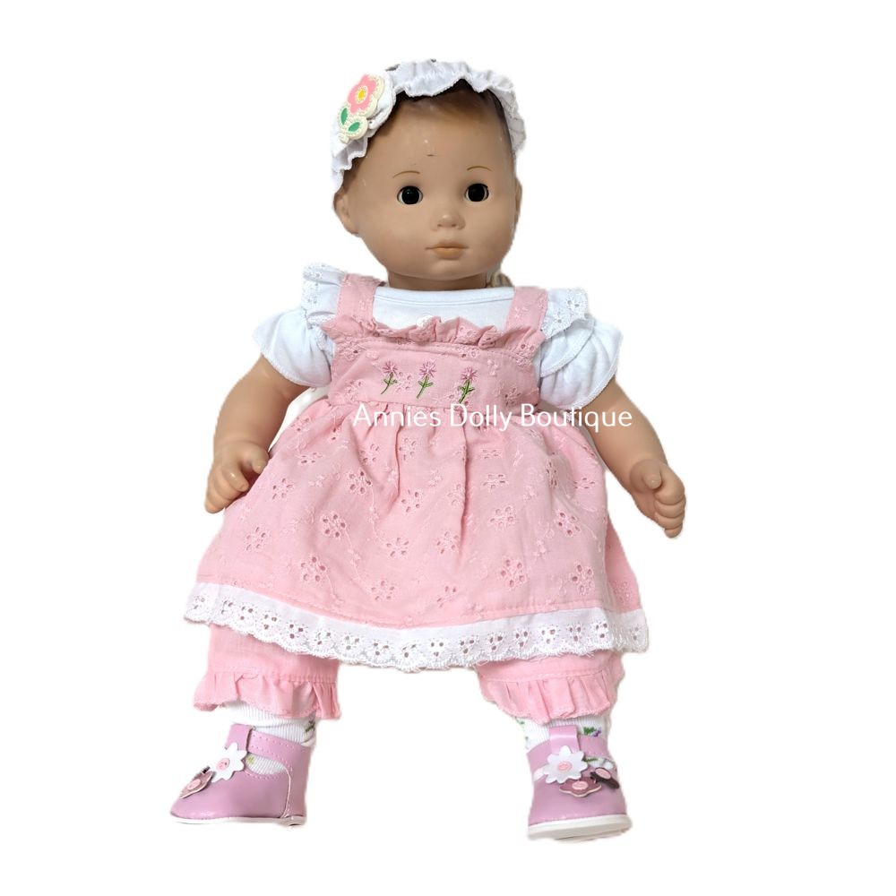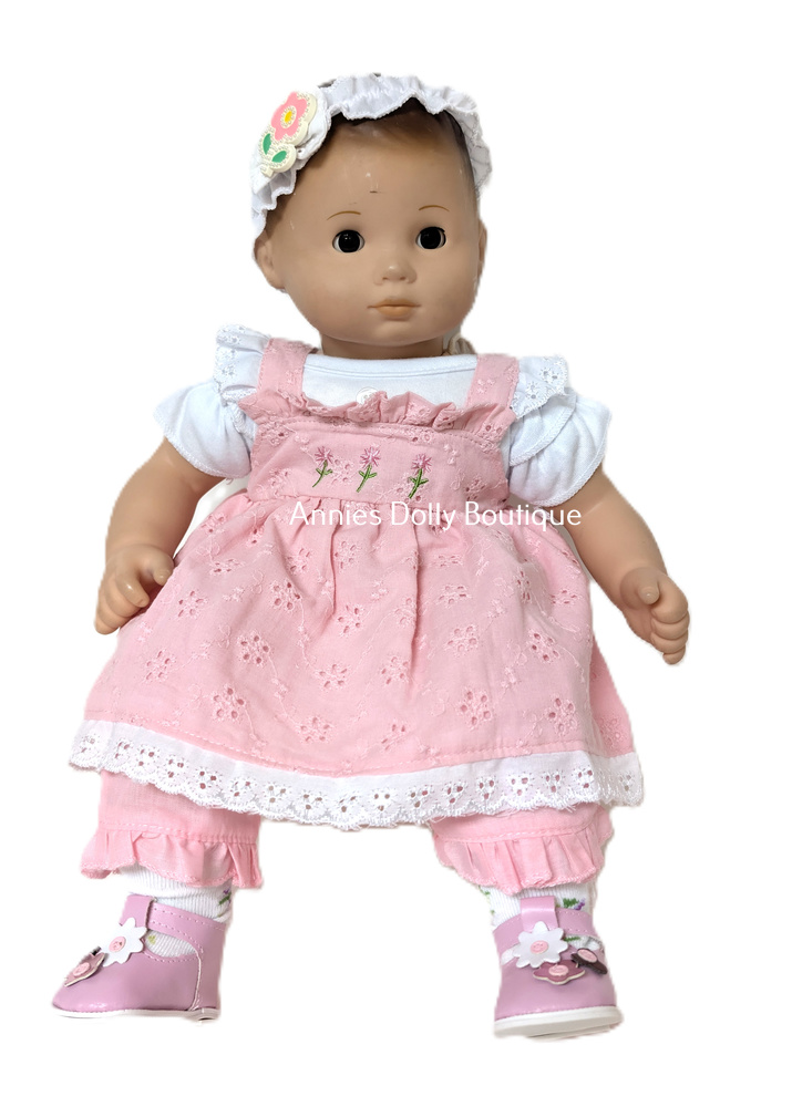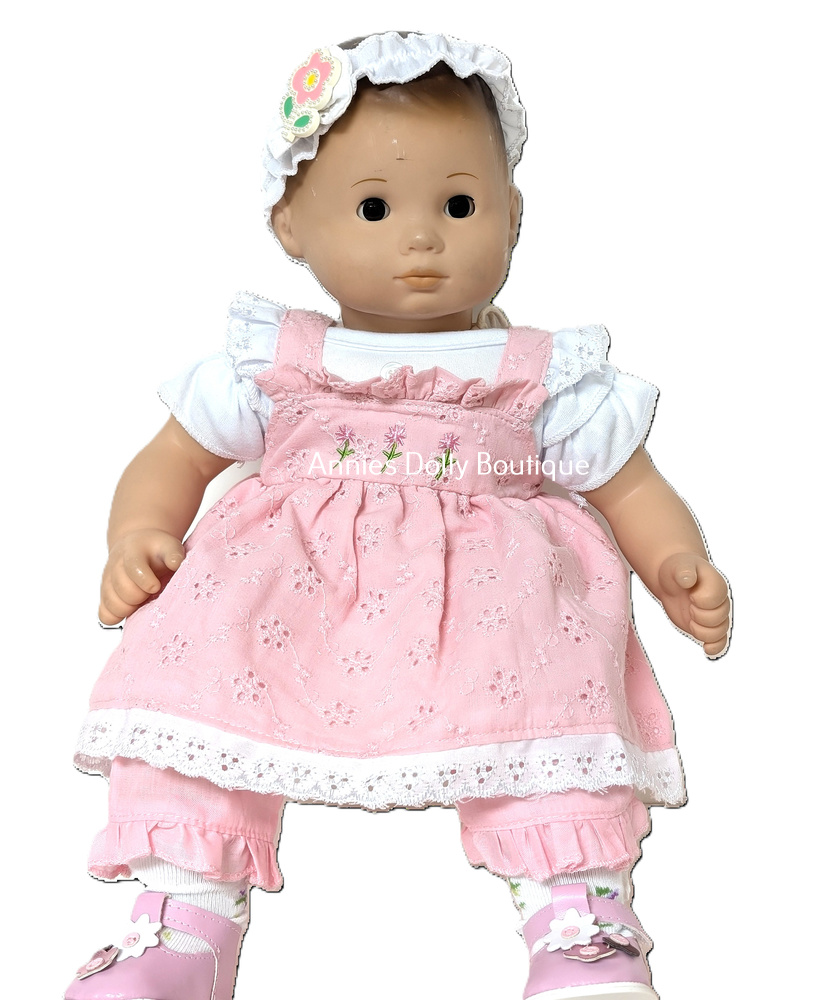 This adorable pink eyelet outfit fits both 16-inch and 18-inch dolls, such as American Girl and Bitty Baby dolls.